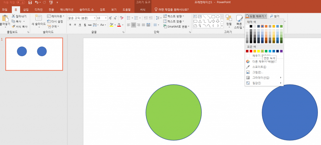 “오른쪽 파란 동그라미를 클릭하신 후 F4” 를 누르면 됩니다..! 다른 페이지에 있는 도형이나 글꼴 색깔도 바꿀 수 있어요.