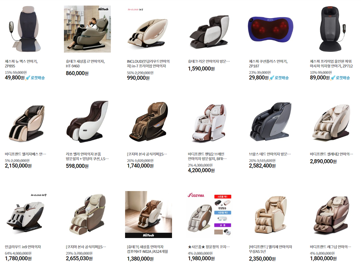 아무래도 나이가 들수록 여기저기 온몸이 쑤신다고 하죠. 자녀들과 함께 살던 시절에는 주로 자녀들이 부모님 안마를 해드렸는데 요즘은 대부분 떨어져 살다보니 그것도 힘들어서 <안마의자>를 선호하시는 것 같아요. 그래서 어버이날 50대 남자선물, 60대 남자선물, 장인어른 선물로 안마의자를 원하시는 분들이 상당히 많은데요.