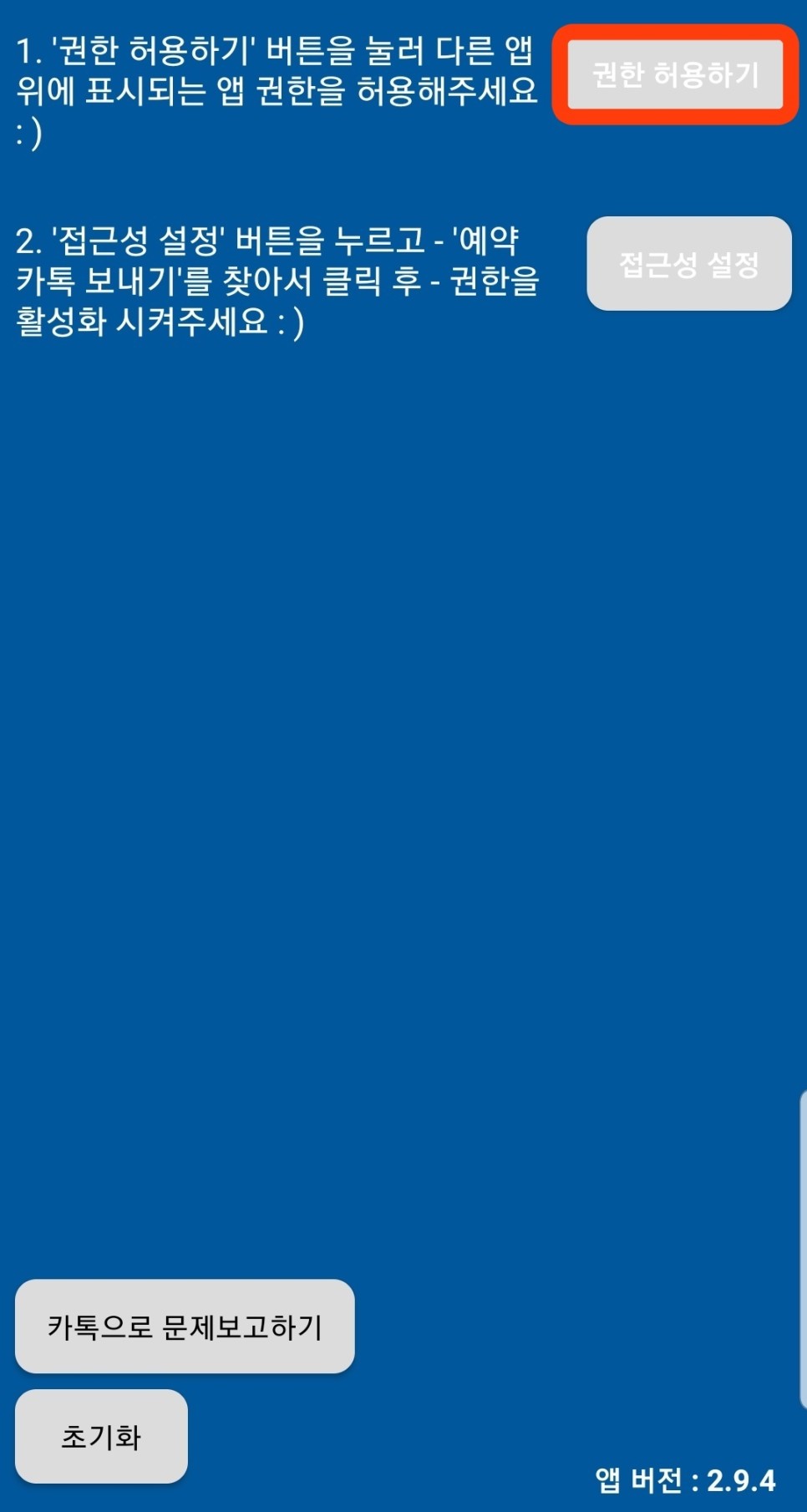프로그램을 설치하시고 앱을 여시면 `권한 허용하기`와 `접근성 설정` 항목이 나오는데요. 우선 `권한 허용하기`부터 다른 앱 위에 표기될 수 있도록 권한을 부여합니다. 그리고 뒤로 가기로 아까 보았던 파란 화면으로 다시 가주면 됩니다.