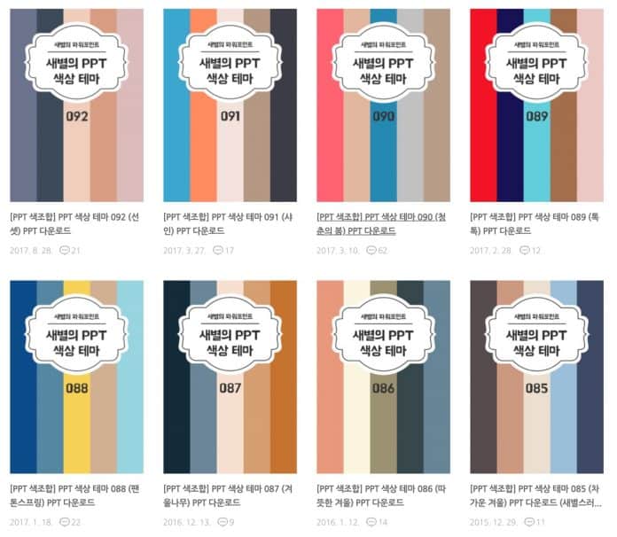 여섯 번째, 무료 피피티 ppt 다운로드 사이트입니다. 새별님이 운영하는 개인 네이버 블로그입니다. 이 블로그에서 제공되는 ppt 템플릿은 컨셉적인 ppt 템플릿보다는 주로 ‘색조합’입니다. 자칫 잘못 선택하면 작업물 전체의 퀄리티를 저하시킬 수 있는 색조합을 깔끔하게 선택하셔서 제공합니다. 단순한만큼 나만의 디자인으로 변형이 쉽고 정말 군더더기 없이 깔끔한 템플릿입니다.