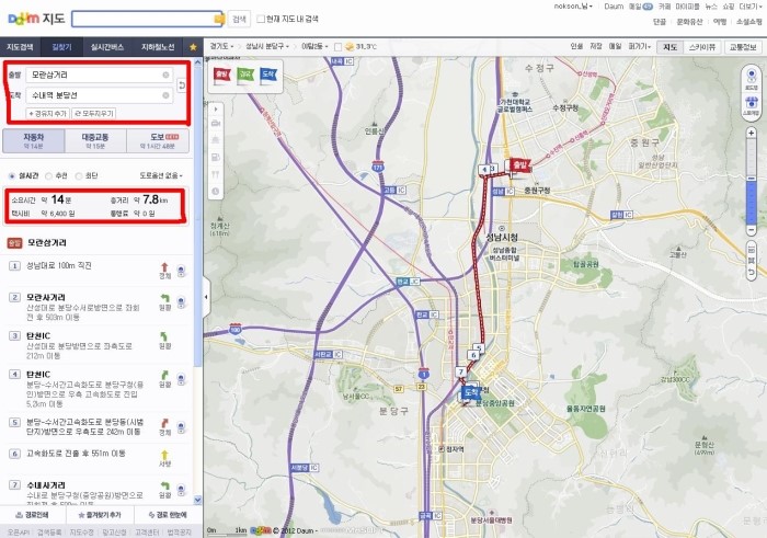 네이버와 거의 UI가 흡사합니다. 왼쪽박스부분의 길찾기를 클릭하고