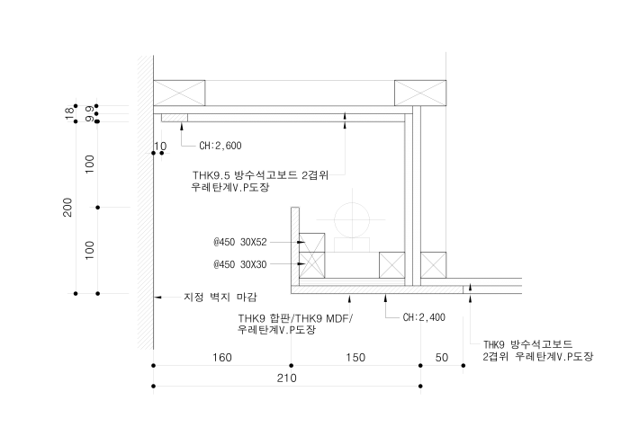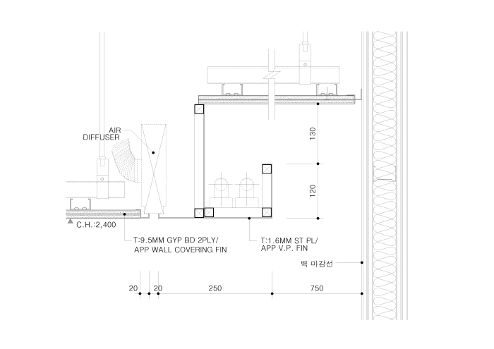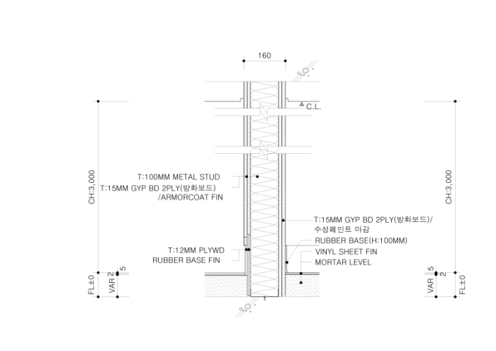 가장 흔하게 볼수있는 벽체 상세도 경량스터드와 석고보드가 어떻게 붙어있는지 볼수있습니다.