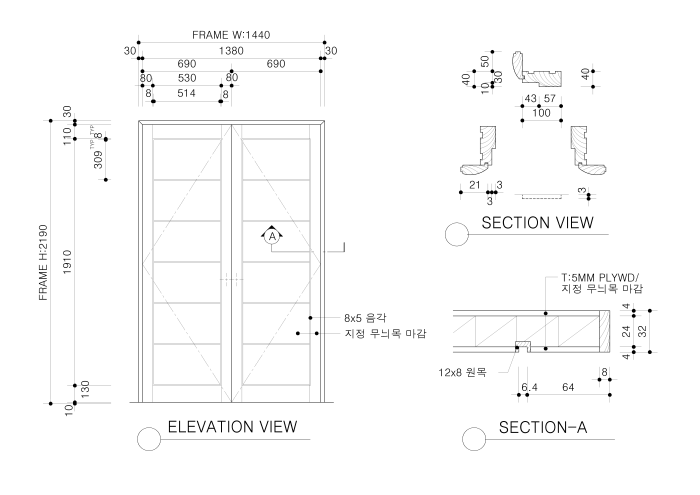 문-양개문 상세도입니다. 요즘은 기성제품을 많이 사용하기때문에 디테일없이 그냥 시공하지만